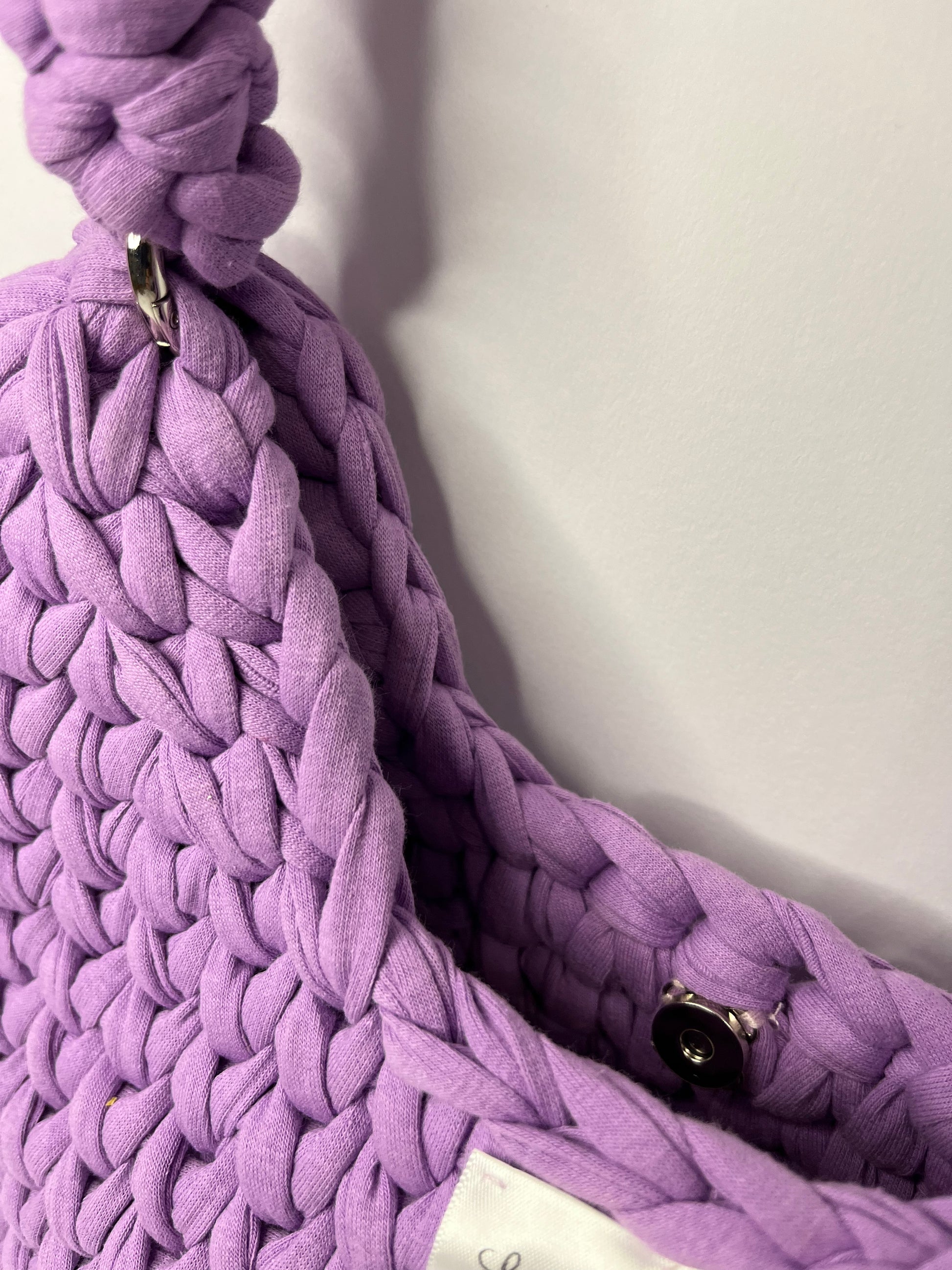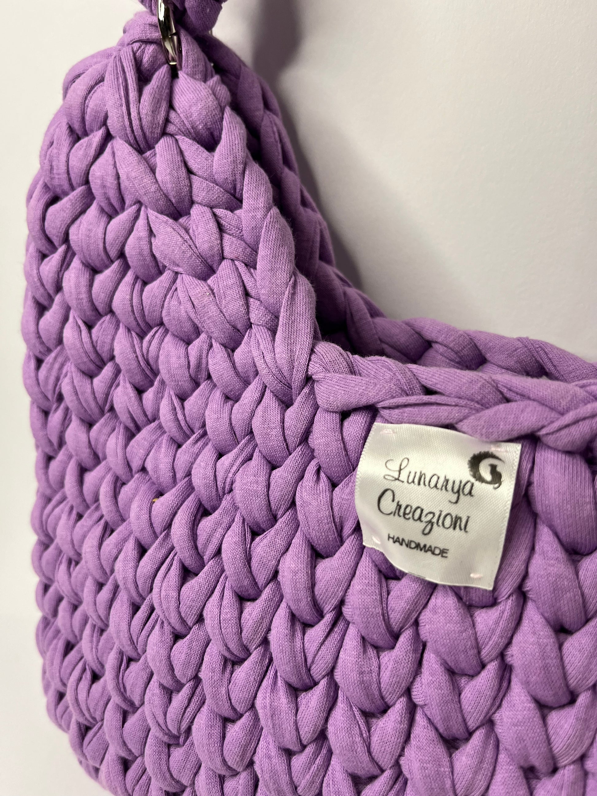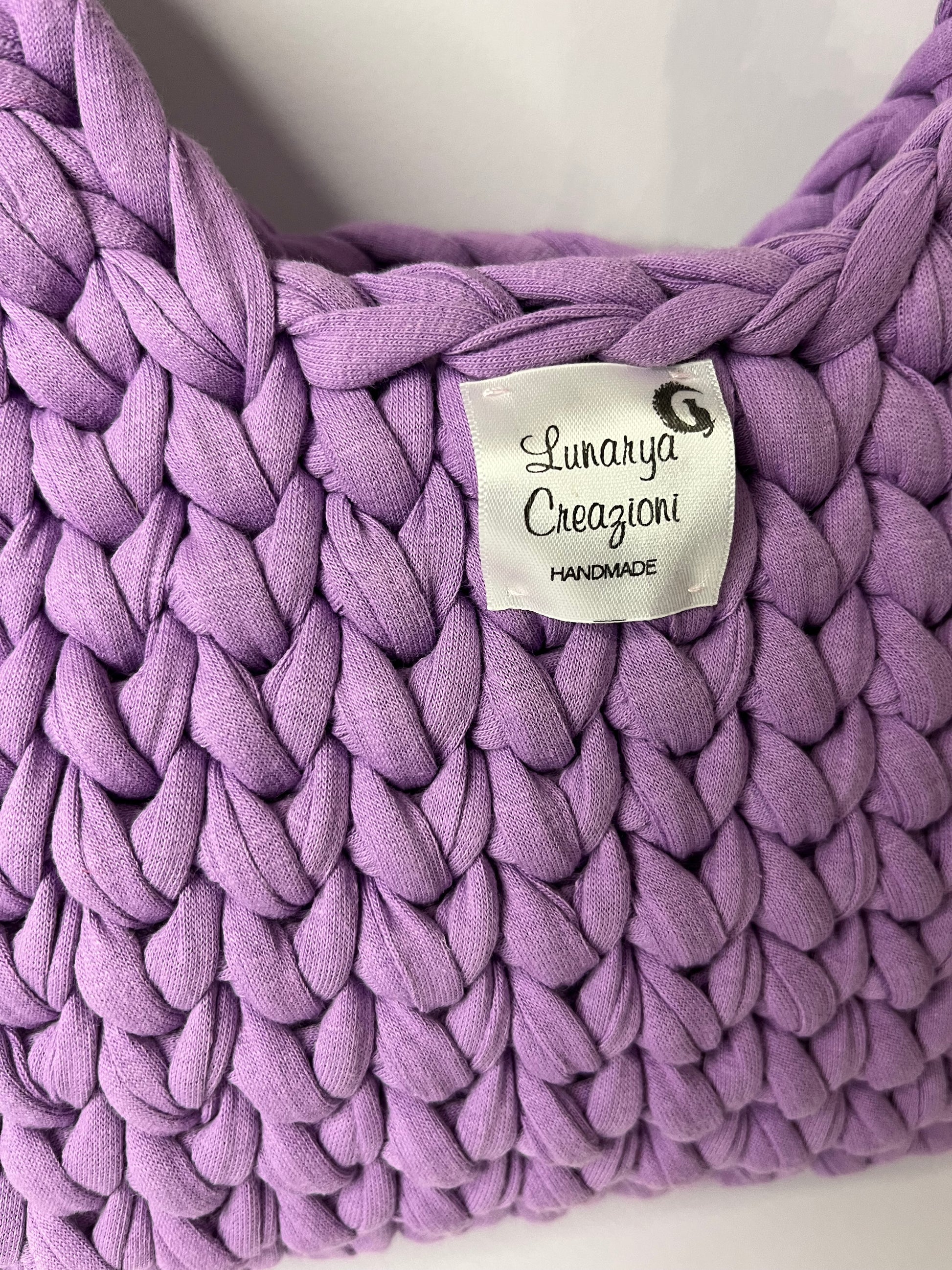 Realizzata a mano con filato di fettuccia spesso e morbido, offre una texture voluminosa e una struttura compatta.