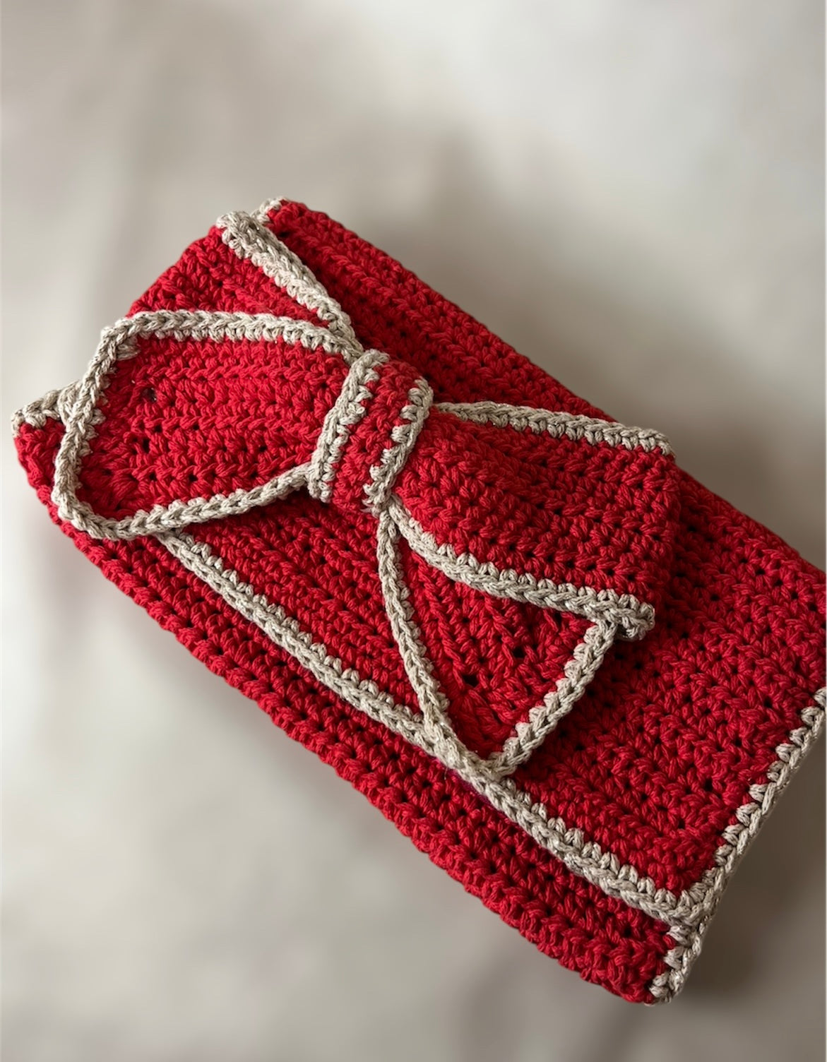 Eleganza e dolcezza si incontrano in questa pochette interamente realizzata a mano all’uncinetto.