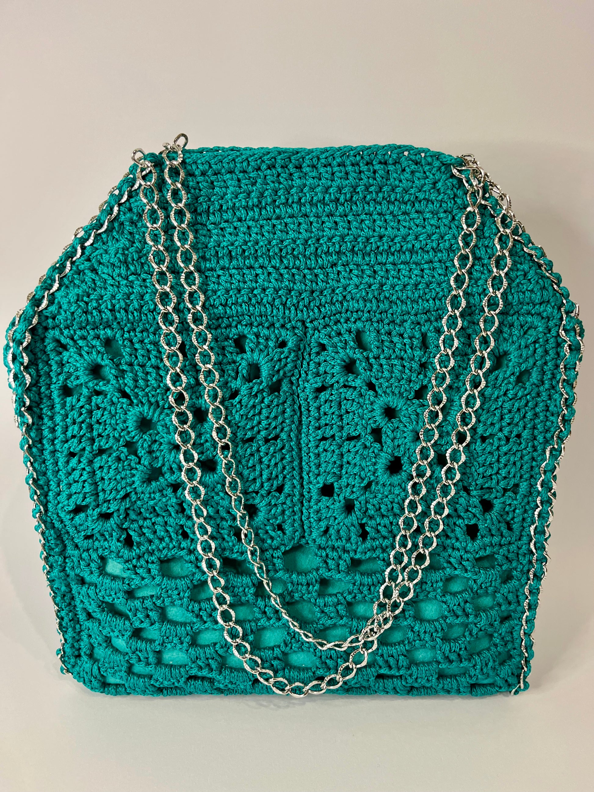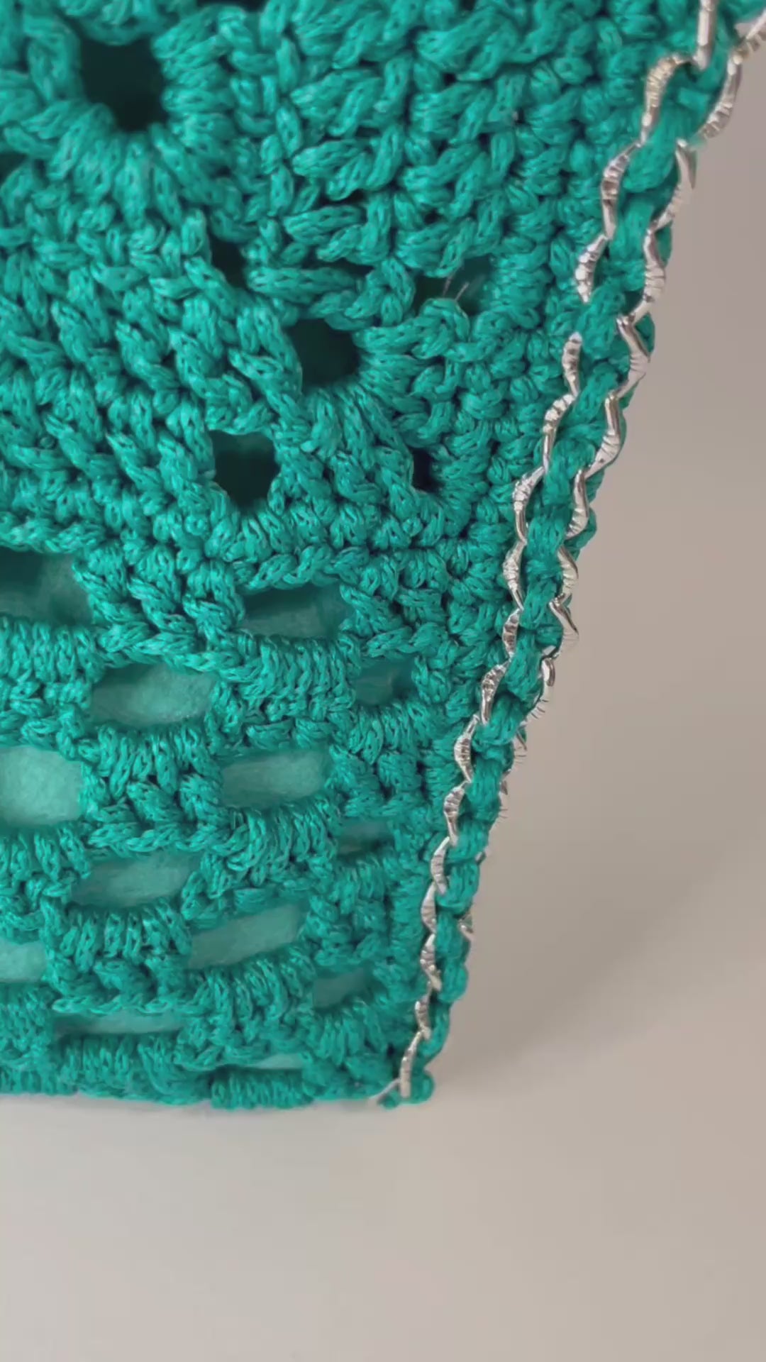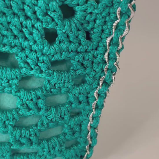 La borsa Mermaid è realizzata all’uncinetto con resistente cordino verde smeraldo e rifinita con una catena argentata che la rende perfetta sia di giorno che di sera.